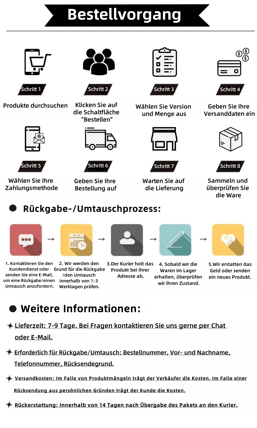 Wenn Sie Fragen haben, können Sie uns innerhalb von 14 Tagen kontaktieren, um die Rücksendung und Rückerstattung zu organisieren.