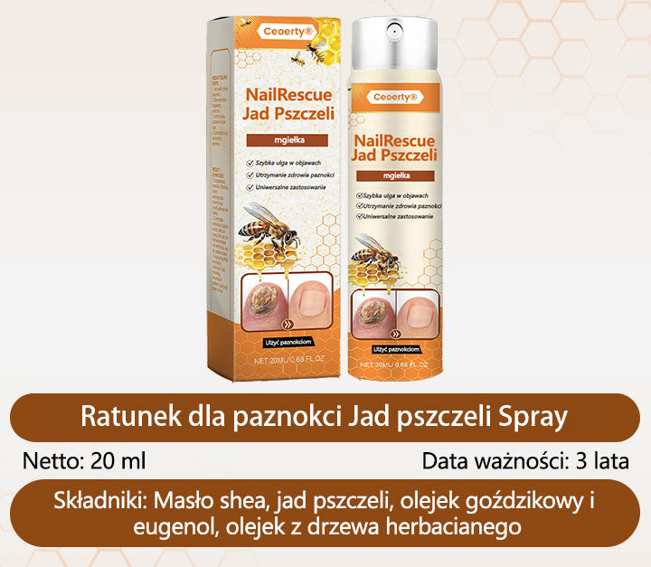 „Po latach zmagań z bolesną zanokcicą i wypróbowaniu niezliczonych metod leczenia nic nie działało — aż do momentu, gdy odkryłam ten spray do paznokci z jadem pszczelim. Łatwo się go aplikuje i szybko wysusza infekcję i uszkodzone paznokcie. Po raz pierwszy widzę prawdziwą poprawę. To jedyny zabieg, który faktycznie zrobił różnicę!”