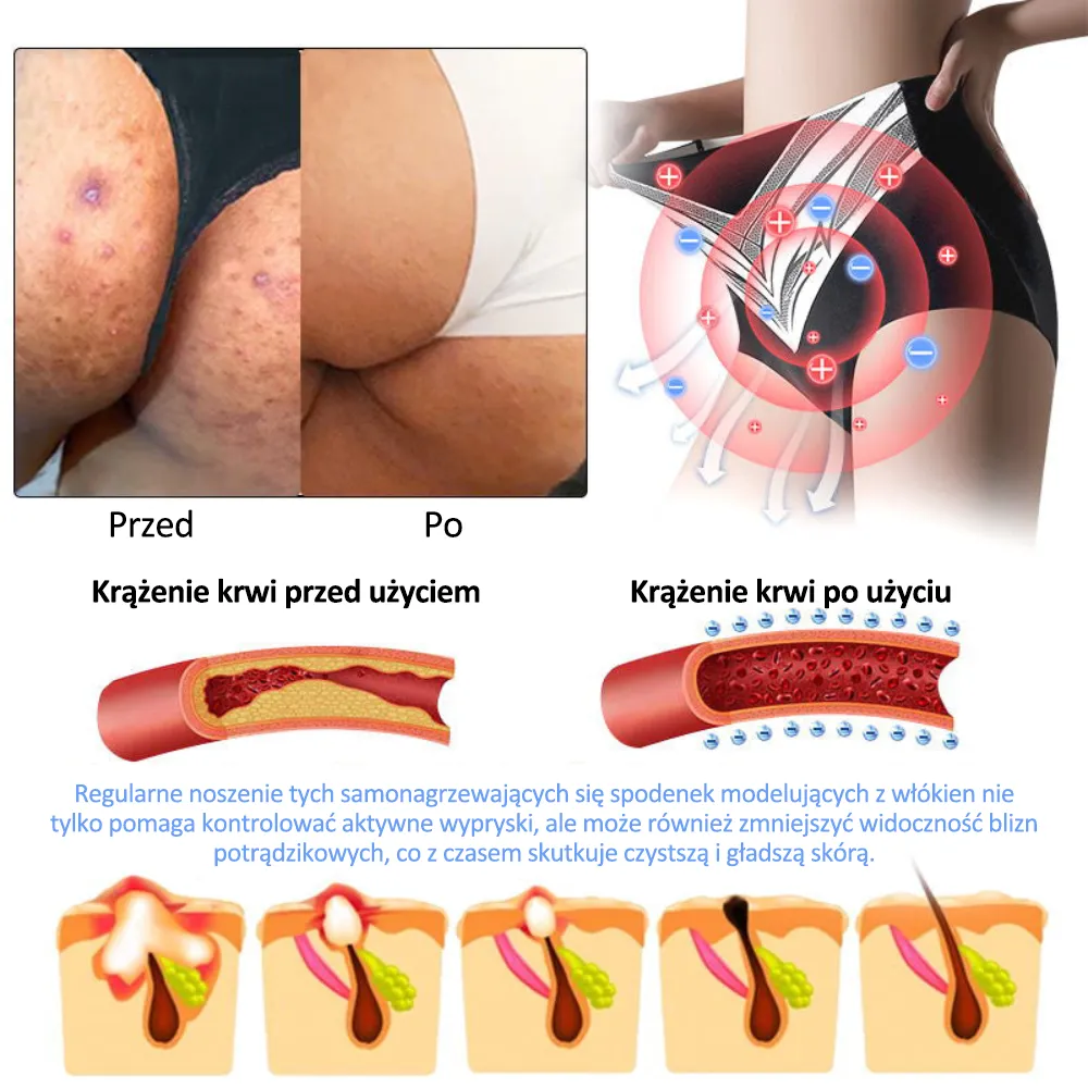 Szorty, wykorzystujące tytanowe włókna uwalniające negatywne jony, neutralizują wolne rodniki, redukują stres oksydacyjny i wspomagają detoksykację, co jest kluczowe w redukcji blizn, rozstępów i trądziku, a także w łagodzeniu objawów ginekologicznych. Badania pokazują wyniki już po dwóch tygodniach.