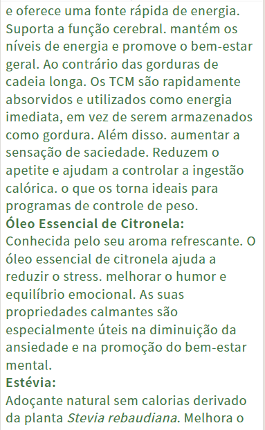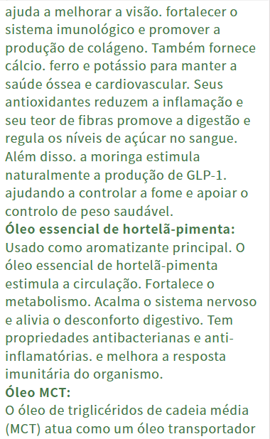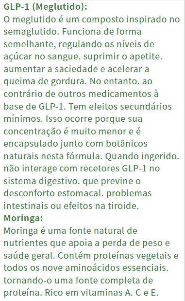 Ingredientes: GLP-1 (Meglutido). Moringa. Óleo essencial de hortelã-pimenta. Óleo MCT. Óleo essencial de citronela. Estávia