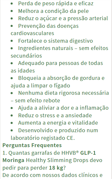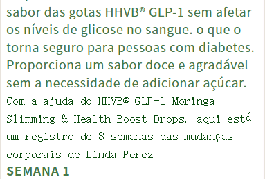 "Olá. Sou uma mulher de 40 anos. Tenho 1 metro e 72 centímetros de altura e peso cerca de 121 kg. Eu viajo muito. por isso como frequentemente em restaurantes. A comida lá é geralmente rica em gordura e carboidratos. e sem perceber. Fui ganhando peso progressivamente. Eu tentei dietas e exercícios. Mas eles não funcionaram para mim – a fome era insuportável. Foi por isso que decidi procurar uma forma de controlar o meu apetite e combater o meu excesso de peso sem recorrer a medidas drásticas. Eu encontrei HHVB® GLP-1 Moringa Emagrecimento & Health Boost Drops no Facebook. Vi que tinha tido um impacto positivo em muitas pessoas. Então decidi experimentar. O sabor e aroma eram agradáveis. E desde o primeiro momento senti como se meu corpo começasse a se limpar por dentro. Alguns dias depois, notei que meu apetite diminuiu consideravelmente. Os meus movimentos intestinais tornaram-se mais regulares e senti sempre um ligeiro calor no abdómen. Um sinal de que meu metabolismo estava melhorando. O meu estado mental também melhorou consideravelmente: tinha mais energia durante o dia e sofria menos insónias à noite."