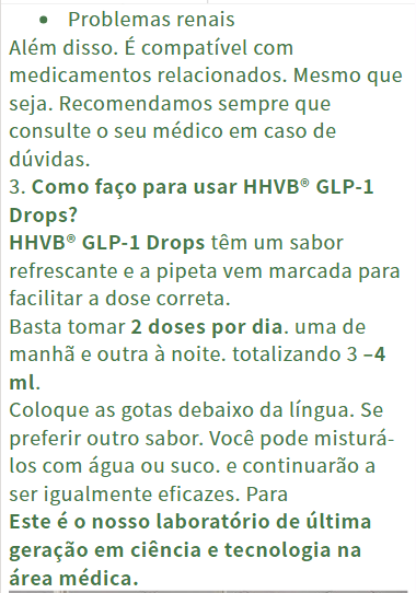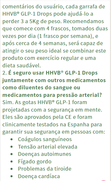 É ótimo para quem procura combater problemas de saúde associados à obesidade. E eu recomendo totalmente. Uma única garrafa de HHVB® GLP-1 Drops oferece mais benefícios do que 15 dias consecutivos de exercício constante. marcando um marco na luta global contra a obesidade.